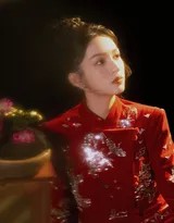 周也轻抚红色纱裙,姿态优雅如古典画卷,眼中闪烁着对新年的无限憧憬