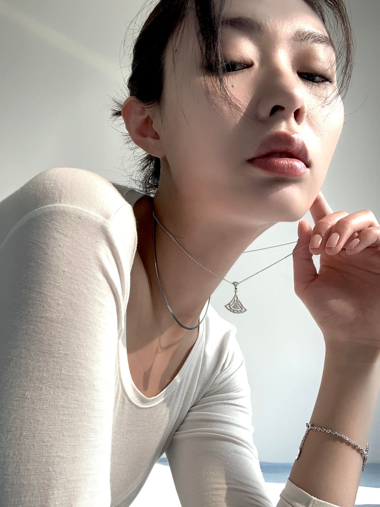 发型与配饰的搭配也至关重要。过于厚重的刘海可能会将视觉重心过度压抑在下庭,显得不够清爽。大方地露出额头,或将发型打理得清爽利落,能让整体形象更显大气舒展。在配饰上,一对线条修长的吊坠耳环,能够有效拉长脸部线条,平衡唇部的量感,并增添精致度。