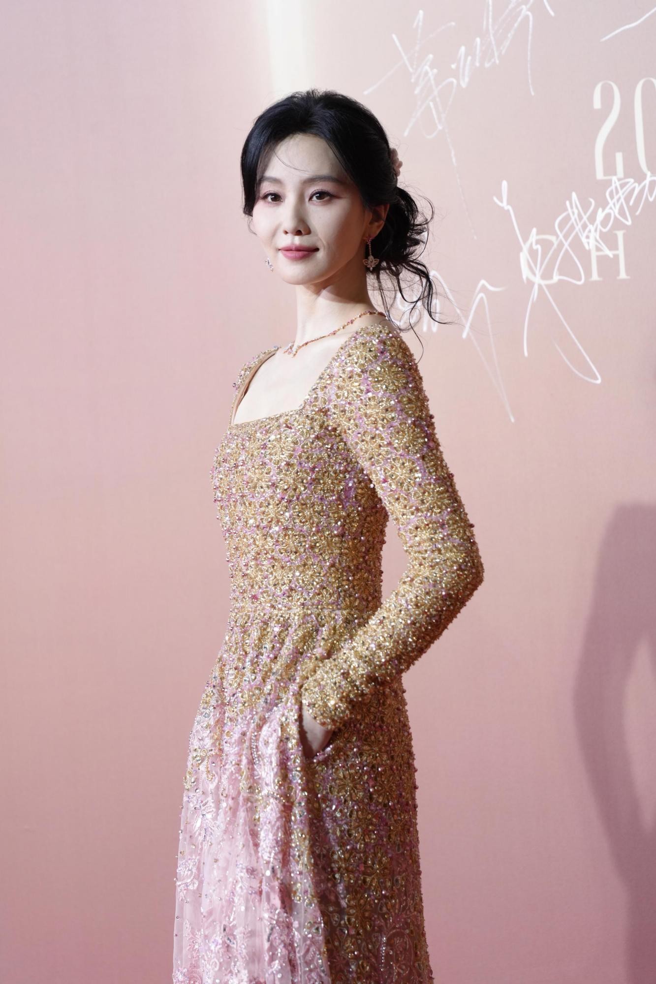 值得一提的是,这组照片的魅力很大程度上源于其“生图”属性。没有影棚里完美的灯光布景,也没有后期过度的肌肤磨皮,图片中皮肤的质感、礼服面料的光泽乃至现场的光影都显得无比真实。这种真实感非但没有折损她的美丽,反而让那份优雅变得更加可触可感。脸颊旁自然散落的几缕发丝,为整体端庄的造型注入了一丝随性与温柔,让人联想到她此前穿裸粉色礼裙时那种“大家闺秀温婉动人”的神韵。